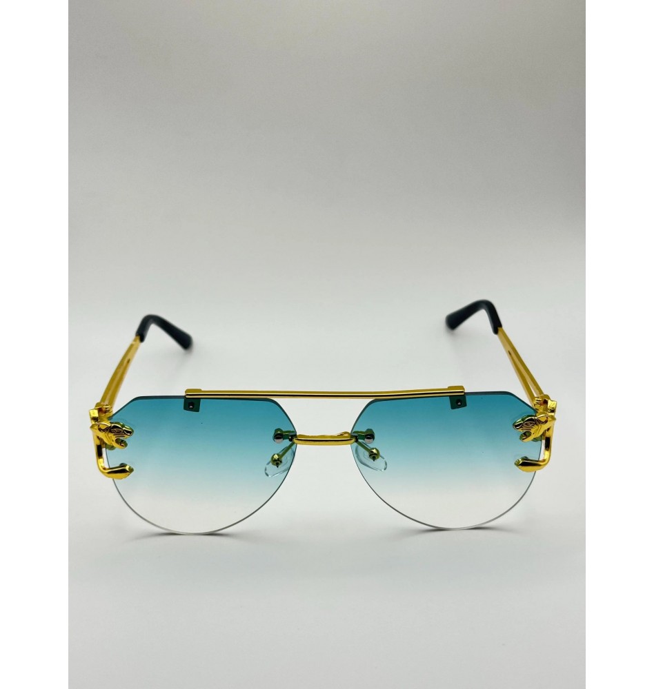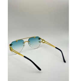 This is a frameless pair of sunglasses that blends the classic aviator silhouette with luxurious three-dimensional embellishments. It features frameless, floating gradient lenses as a base, complemented by a striking gold metal structure and three-dimensional decorative details. It retains the retro vibe of aviator sunglasses while softening their bulkiness through the frameless design. The gold three-dimensional embellishments on the temples (using geometric textures and layered engraving) become the visual focal point, giving the overall style a blend of retro-cool and subtly luxurious appeal. The gradient blue lenses transition from a clear light blue to a deep sea blue, ensuring effective sun protection in strong sunlight while maintaining visual clarity in low light. It's a unique piece that balances practical sun protection with distinctive style—a perfect finishing touch to any look, whether it's a retro motorcycle style or a trendy streetwear outfit.
