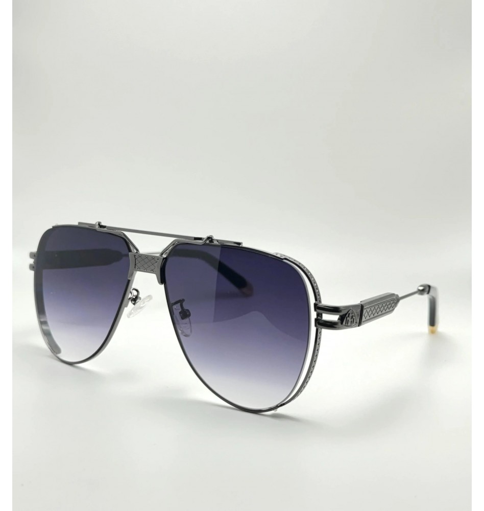 This is a pair of double-bridge aviator sunglasses with a focus on a "retro motorcycle cool" aesthetic. Its core design features a silver-gray metallic textured frame and gradient deep purple lenses. The classic double-bridge aviator silhouette retains its retro vibe, while the precise three-dimensional texture of the frame replicates the rough texture of industrial machinery. Embossed decorative details on the temples enhance its distinctive style. The gradient deep purple lenses transition from a clear light purple to a deep dark purple, ensuring both sun protection in strong light and visual clarity in low light. It's a practical sun protection item for outdoor cycling and commuting, and a key accessory for creating a "motorcycle edgy" or "street style" look—the ruggedness of the metallic texture combined with the bold feel of the aviator frame easily adapts to diverse trendy styles.