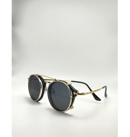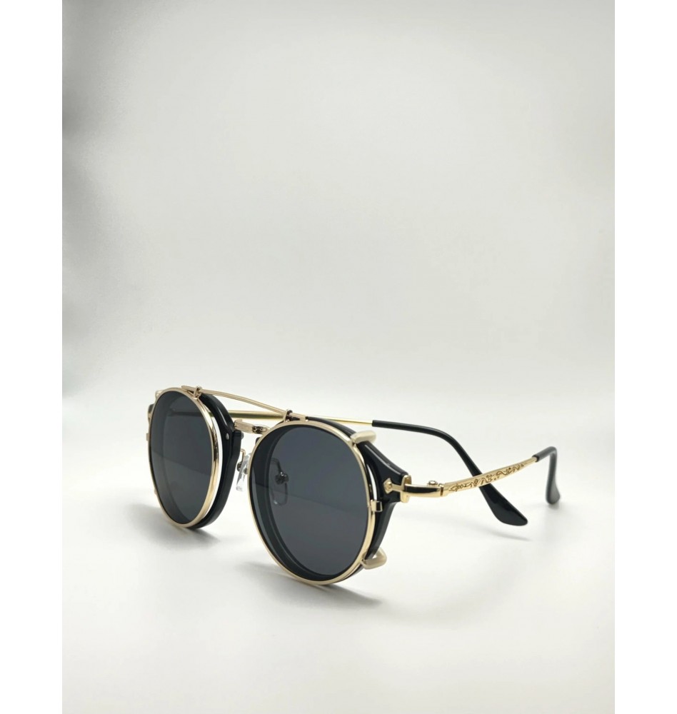 These are double-ring round sunglasses that emphasize a "retro mechanical luxury" feel. The design features a black acetate inner frame and a gold metal outer frame, replicating the classic silhouette of retro eyewear. The round frame naturally suits most face shapes (softening the angles of long faces and narrowing the contours of round faces), while the black and gold color scheme exudes a luxurious retro vibe. The metallic mechanical texture on the temples replicates the exquisite details of old-fashioned instruments, giving this basic retro style a distinctive look. The dark gray, fully blackout lenses completely block strong light and UV rays, making them a practical item for daily commutes and a key accessory for retro enthusiasts to create a "bike-chic" or "sophisticated retro" look. The layered design of the double rings and the exquisite mechanical texture combine to easily strike a balance between practicality and style.